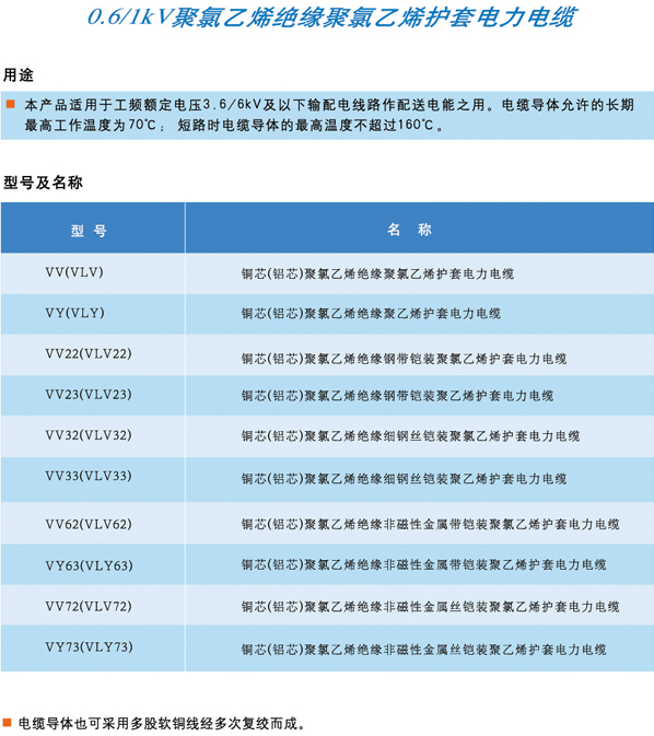 0.6/1kv聚氯乙烯绝缘聚氯乙烯护套电力电缆